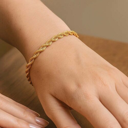 This solid diamond cut rope bracelet comes in 10k yellow gold and has a width of 3.5 millimeters.