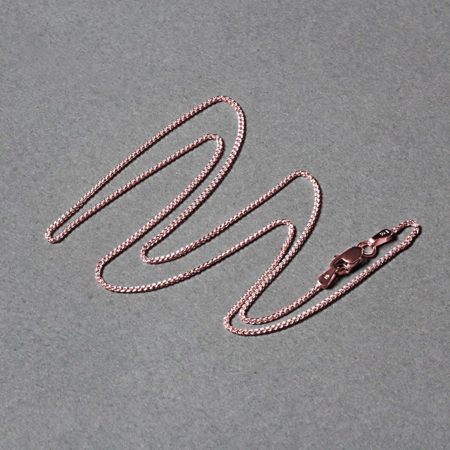 This round wheat chain comes in 14k rose gold and has a width of 1.00 millimeters.