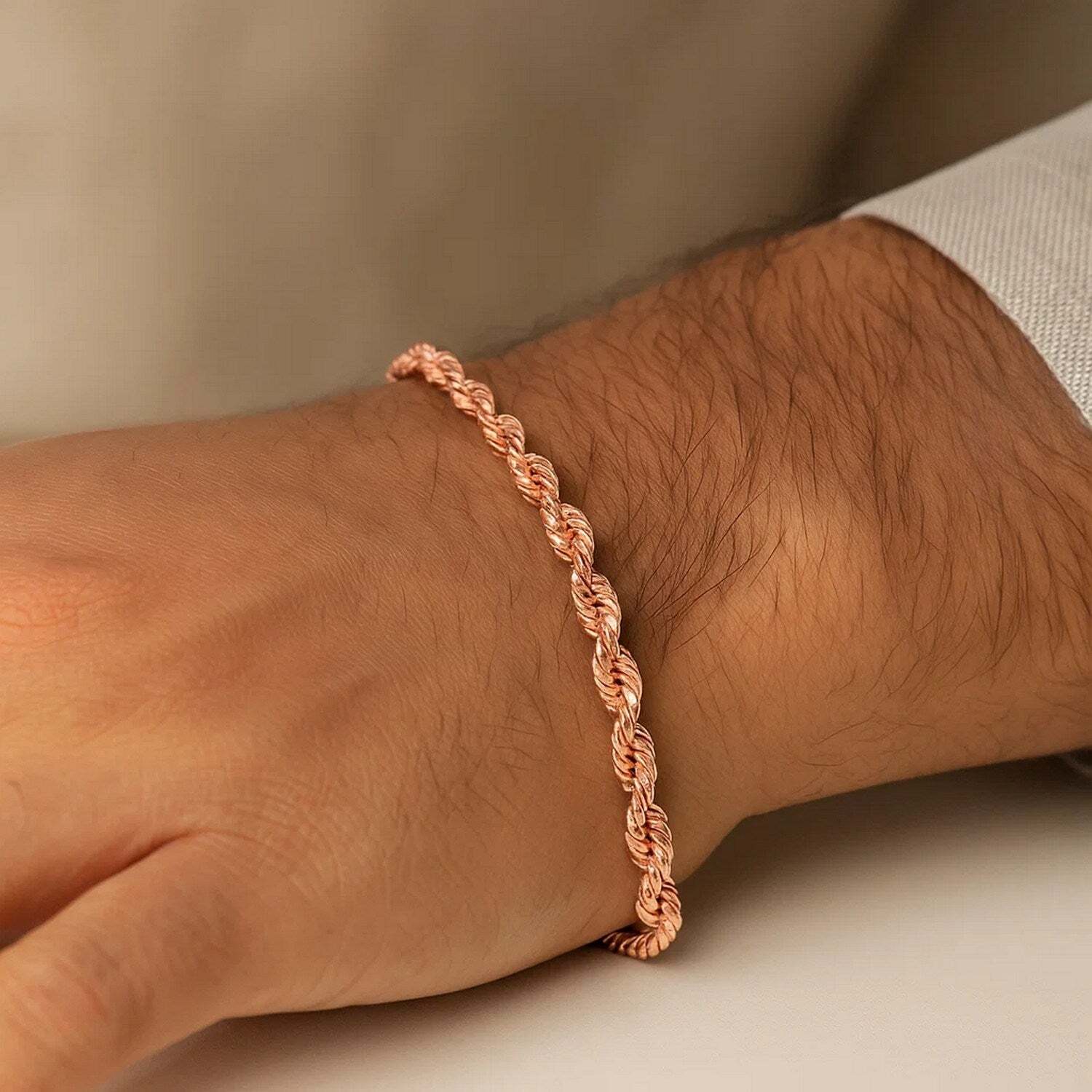 This solid diamond cut rope bracelet chain comes in 14k rose gold and has a width of 4.0 millimeters. Secured with a lobster clasp.