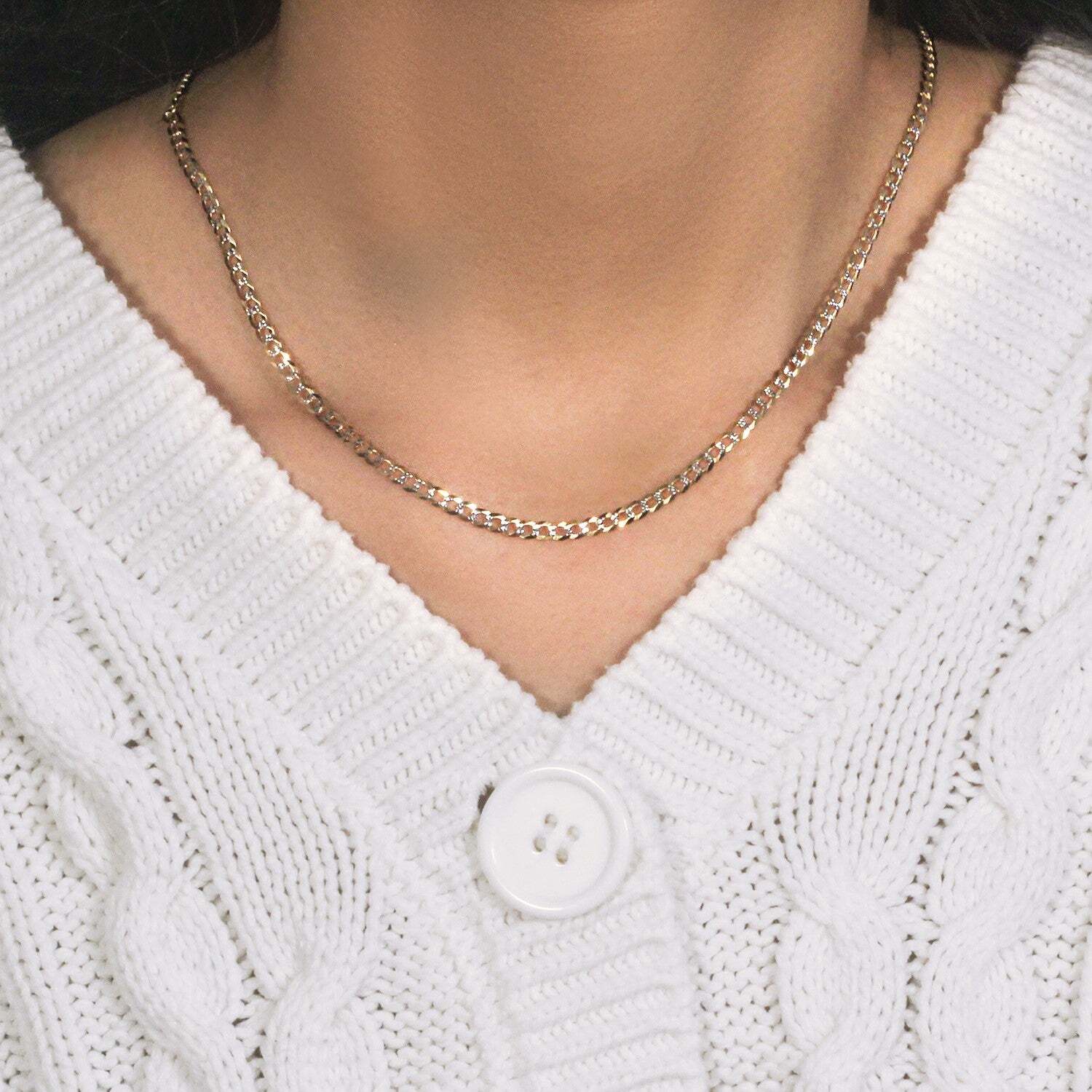 This pave curb chain comes in 14k two tone gold and has a width of 3.20 millimeters.