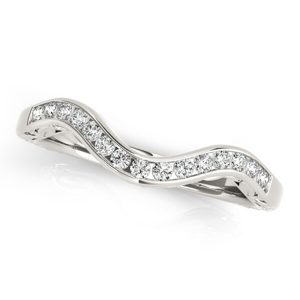 Positively enchanting, this curved design wedding band is a unique beauty. Made of 14k white gold.