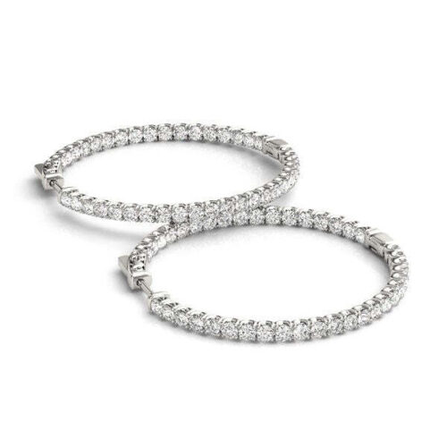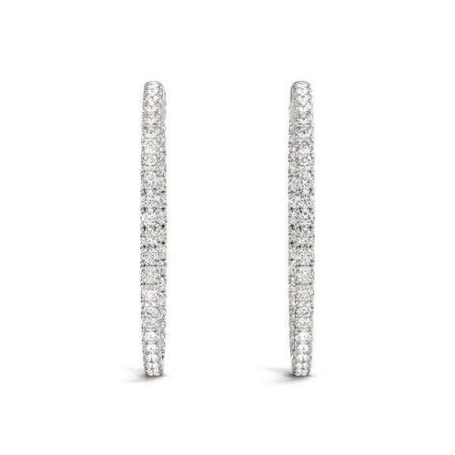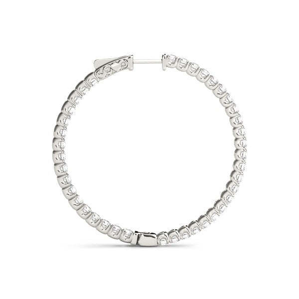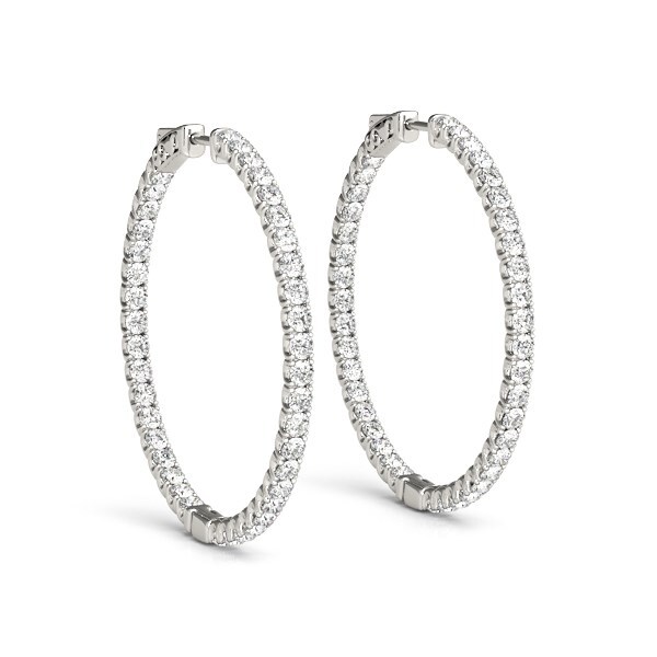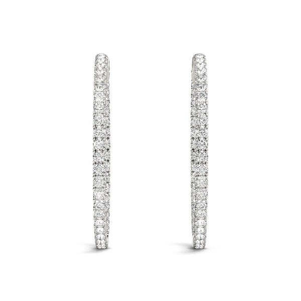 Showcasing a two-sided design, these hoop earrings feature round shared prong set diamonds and a classic hinge closure. Made of 14k white gold.