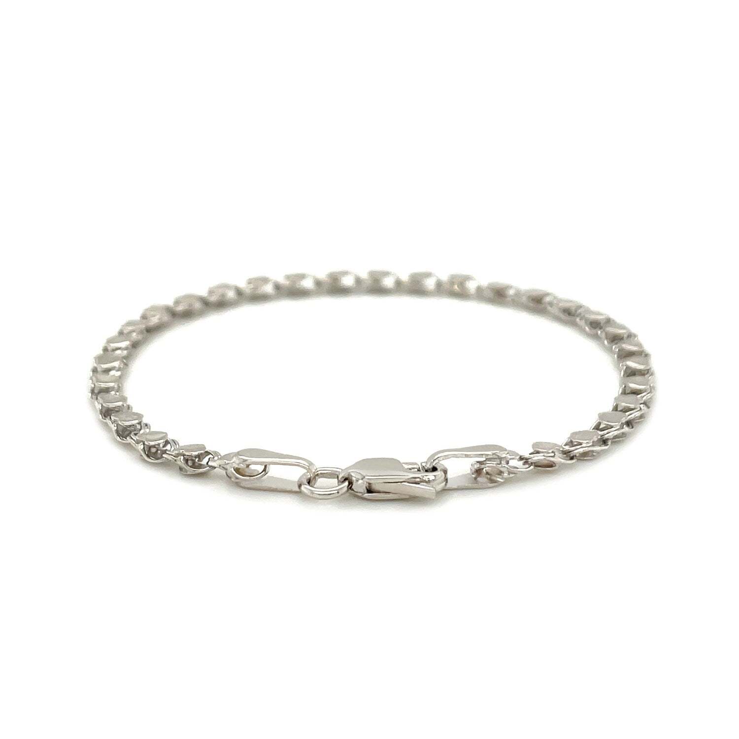 This heart bracelet chain comes in 14k white gold and has a width of 2.9 millimeters. Secured with a lobster clasp.