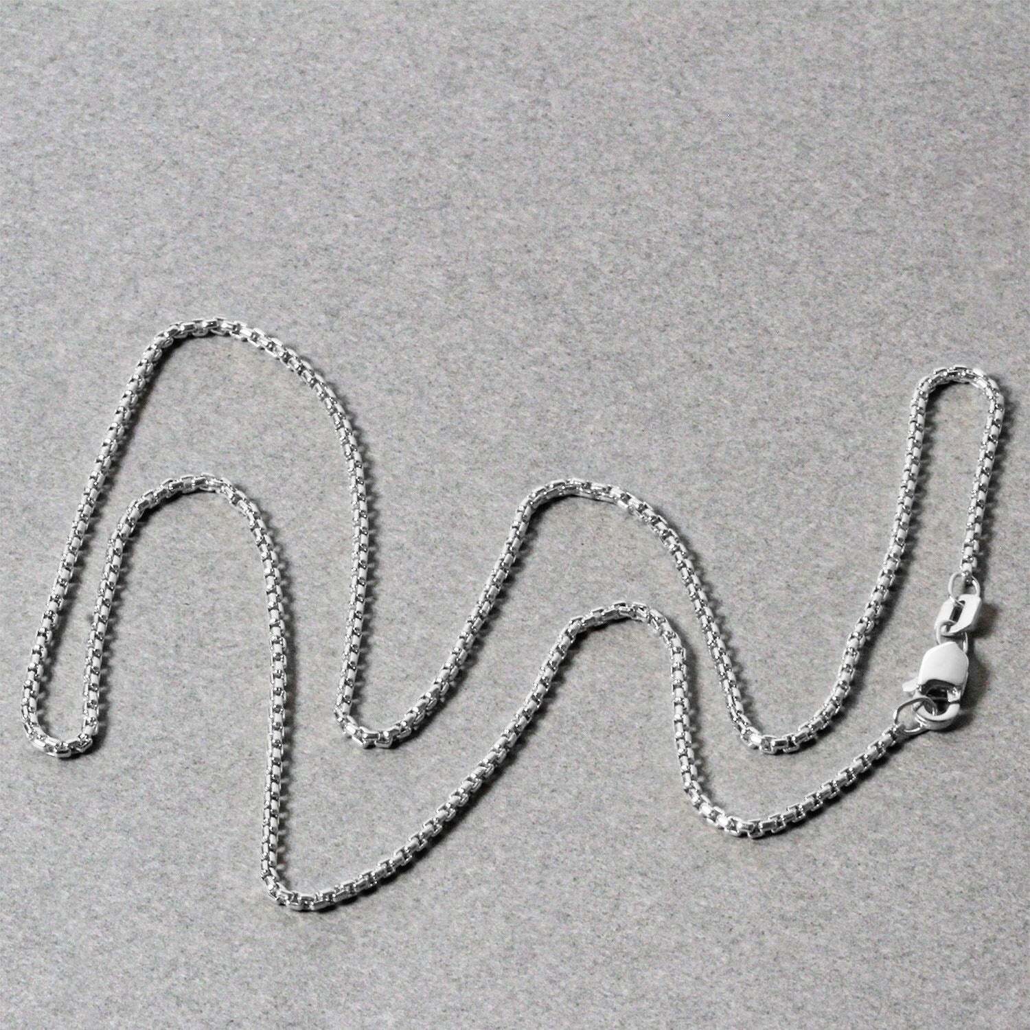This round box chain comes in 14k white gold and has a width of 1.3 millimeters.