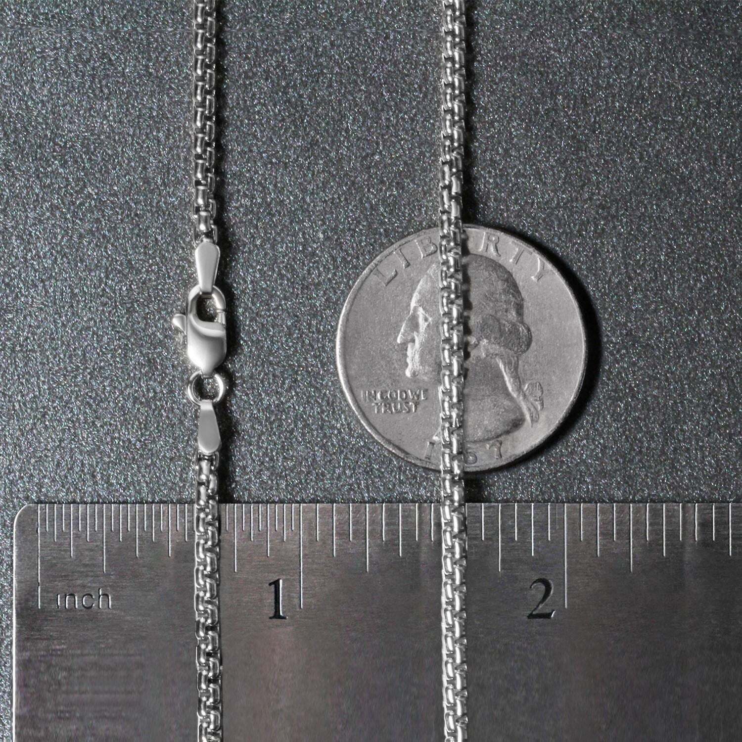 This round box chain comes in 14k white gold and has a width of 2.5 millimeters.