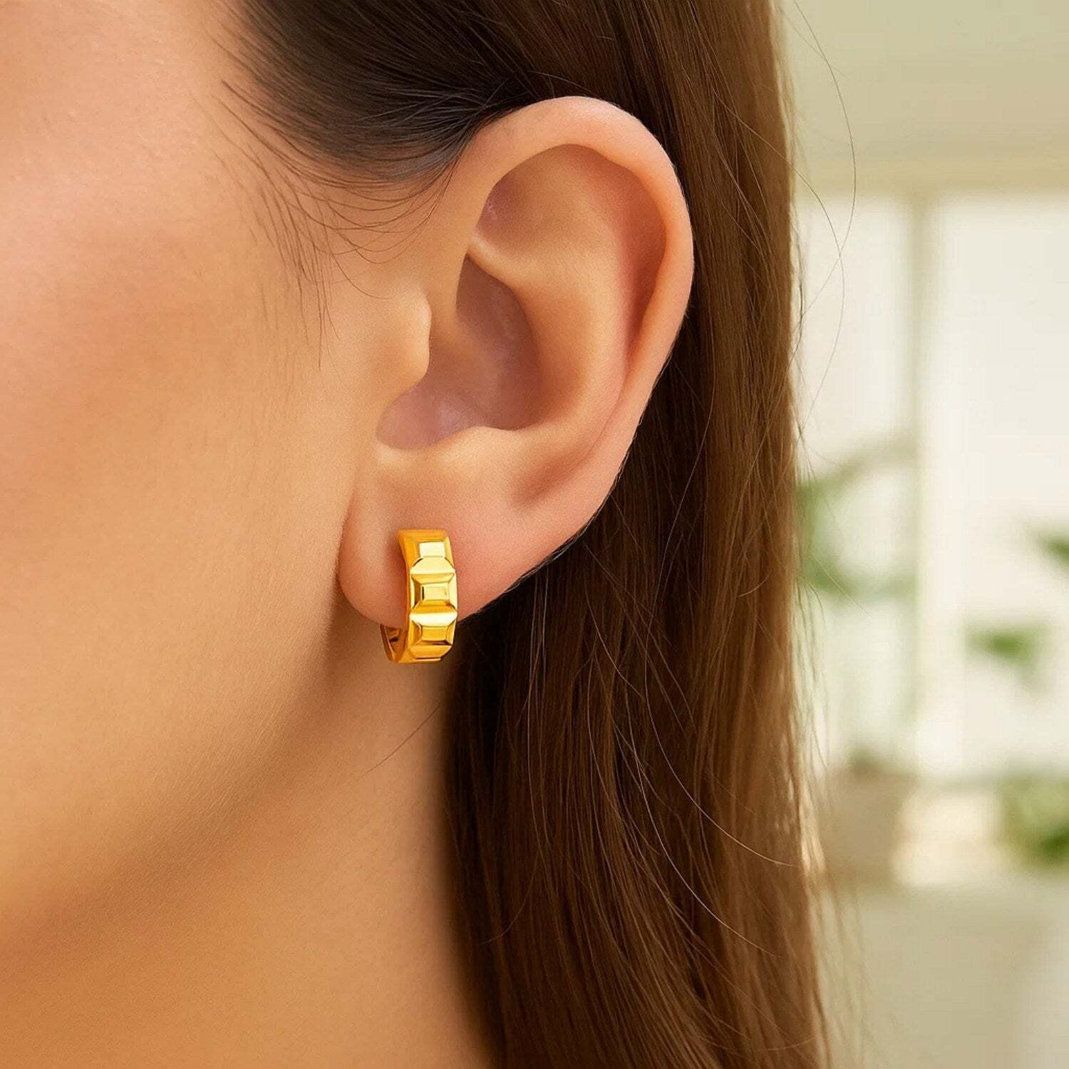 A timeless, architecture-inspired square faceted surface adorns these beautiful 14K yellow gold “huggie” hoop earrings. Hinged earrings measure 12.2×11.4mm.