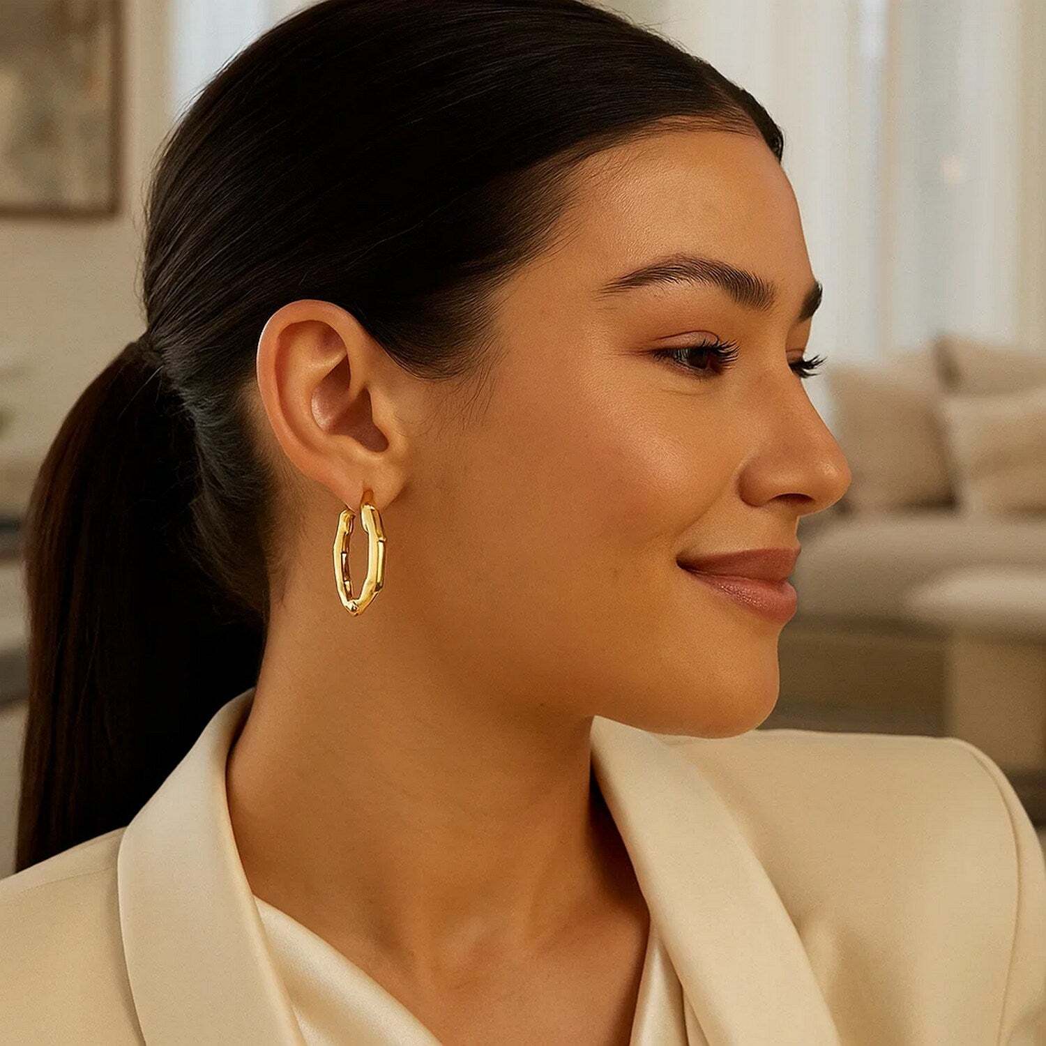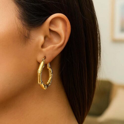 These Medium Bamboo hoop earrings are the perfect elegant & stylish design. These will definitely add a bit of uniqueness to your collection. Crafted in 14k yellow gold with a high polish finish & a snap closure.