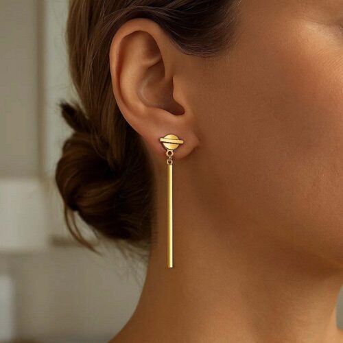 A gorgeous pair of 14k yellow gold bar drops earrings with upper disc elements. Secured with classic push backs.