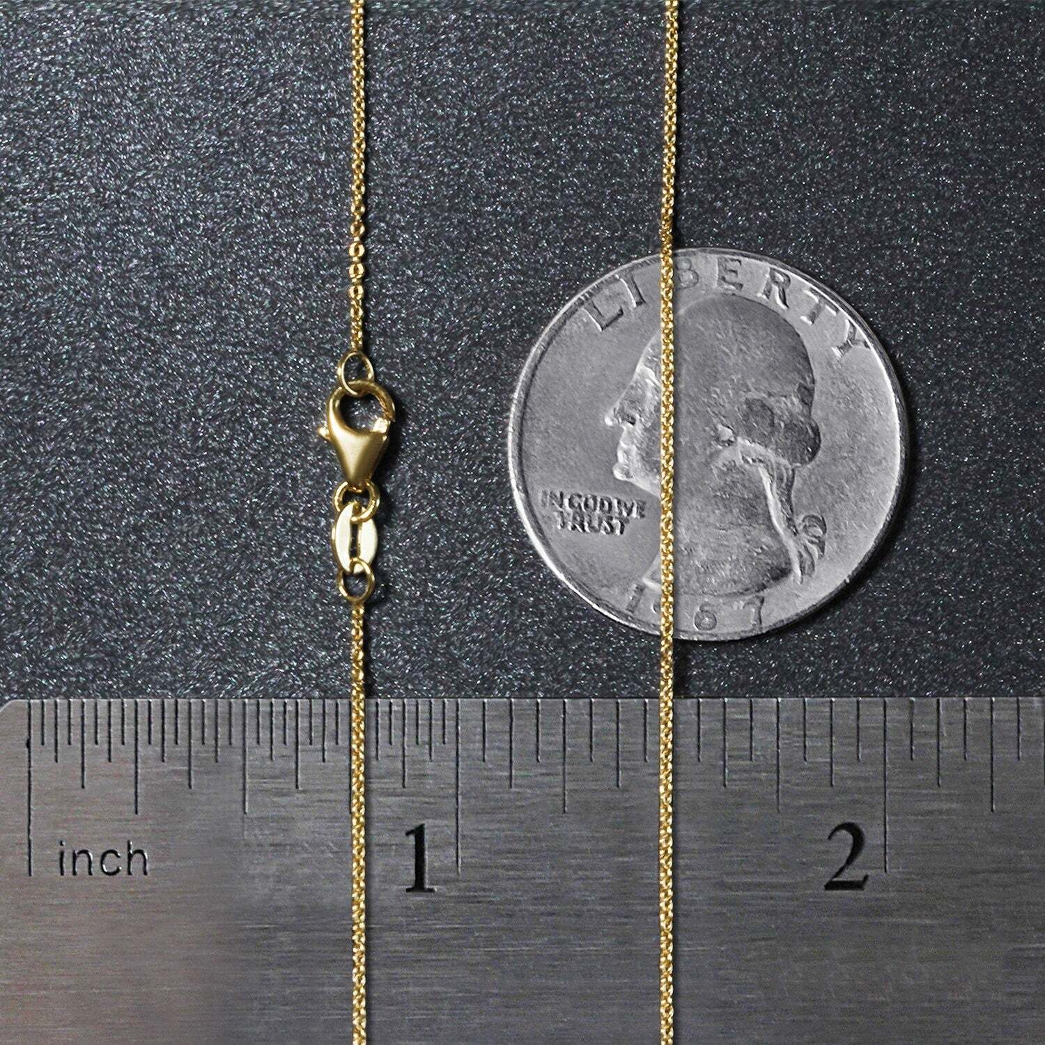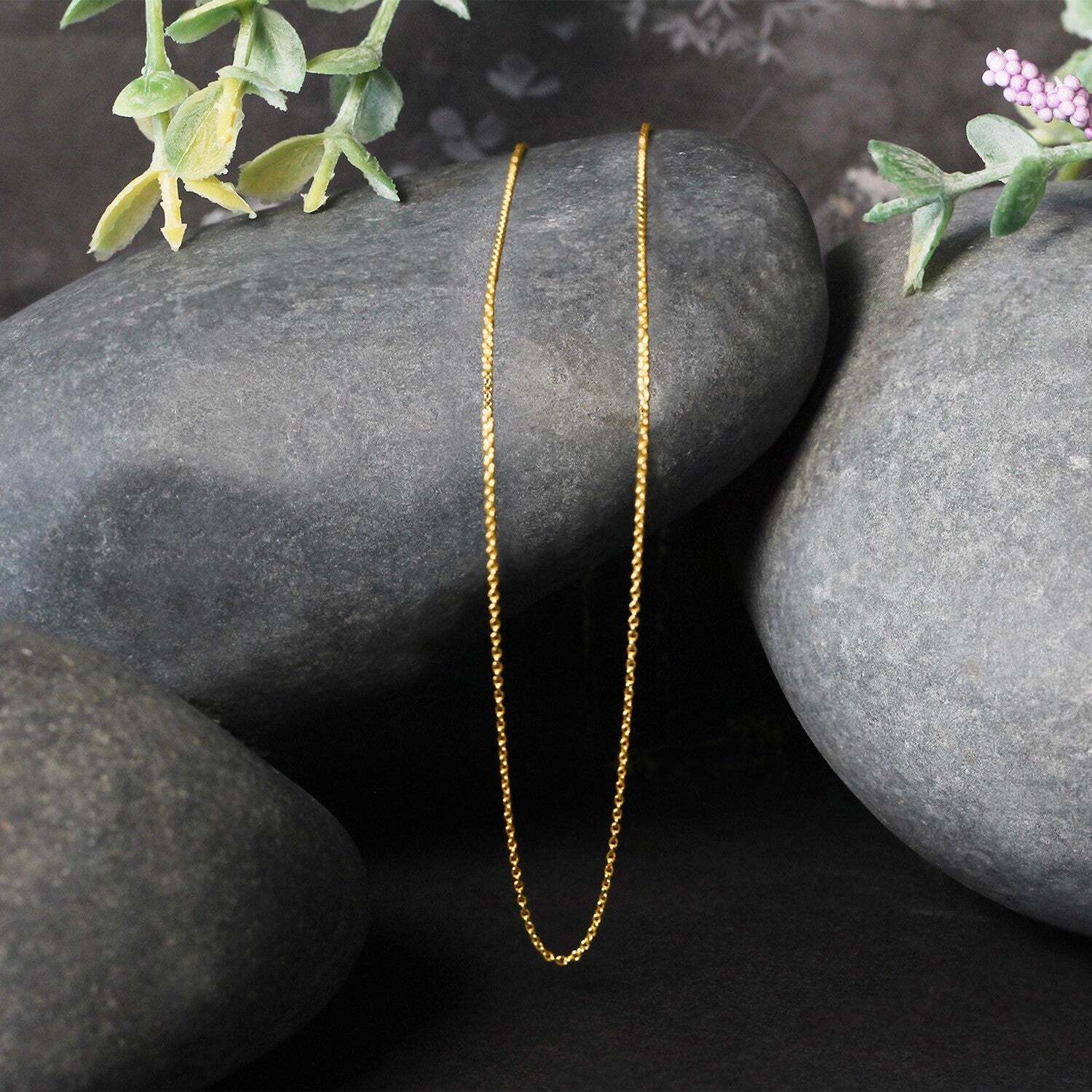 This oval cable link chain comes in 14k yellow gold and has a width of 0.85 millimeters.