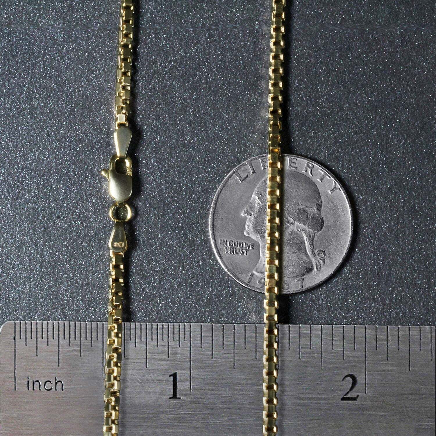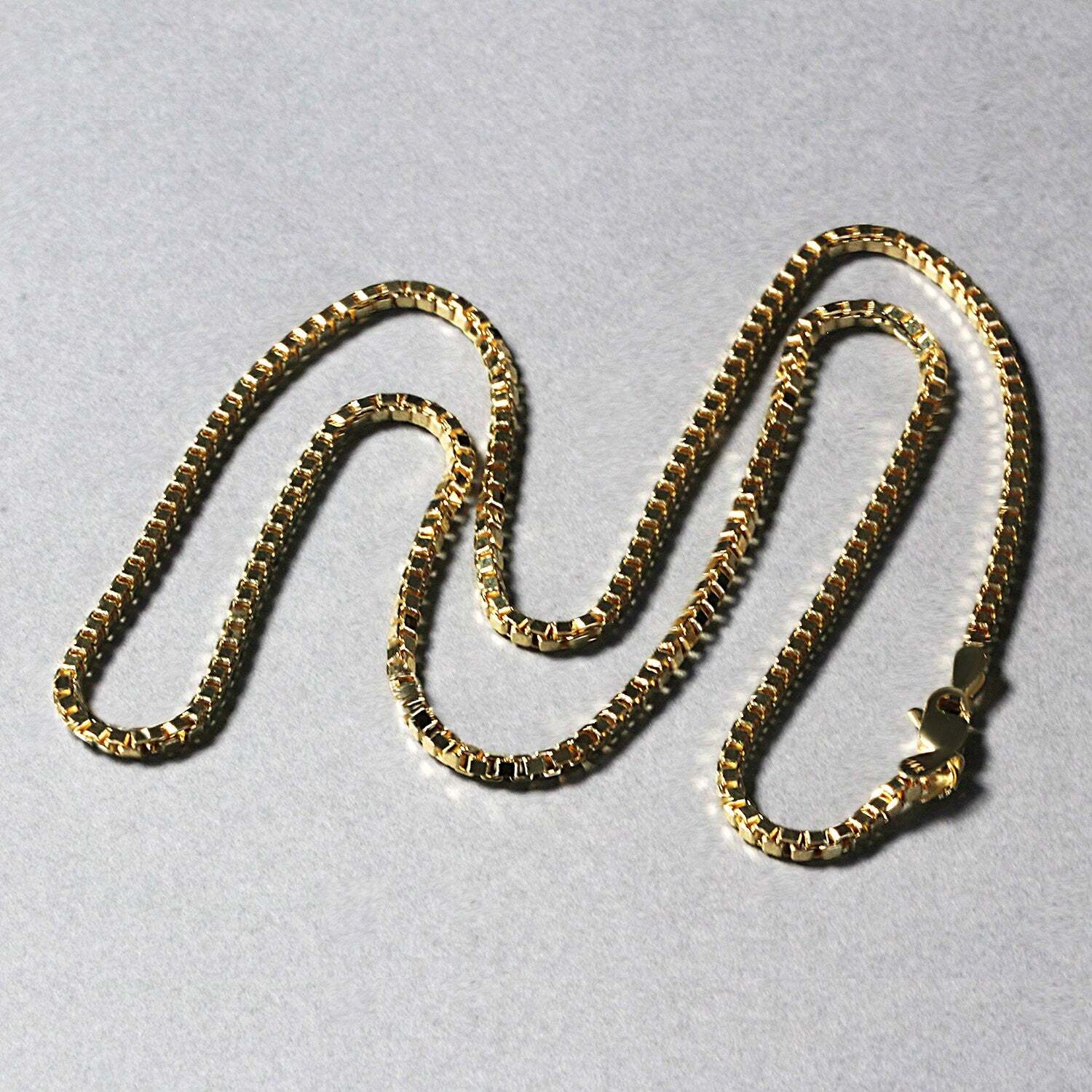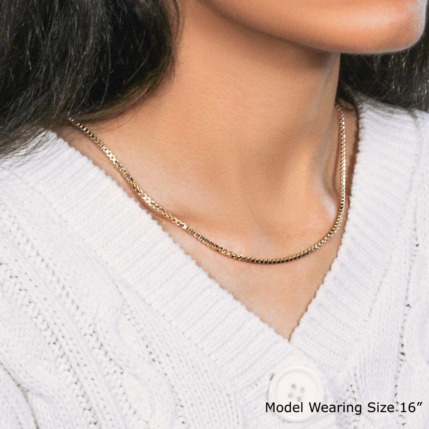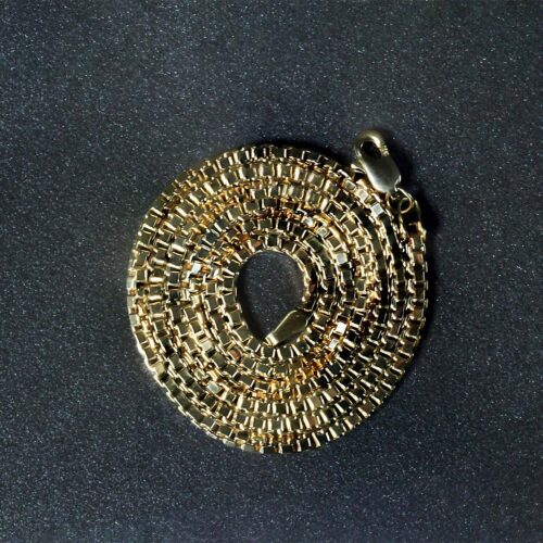 This semi-solid box chain comes in 14k yellow gold and has a width of 2.10 millimeters.