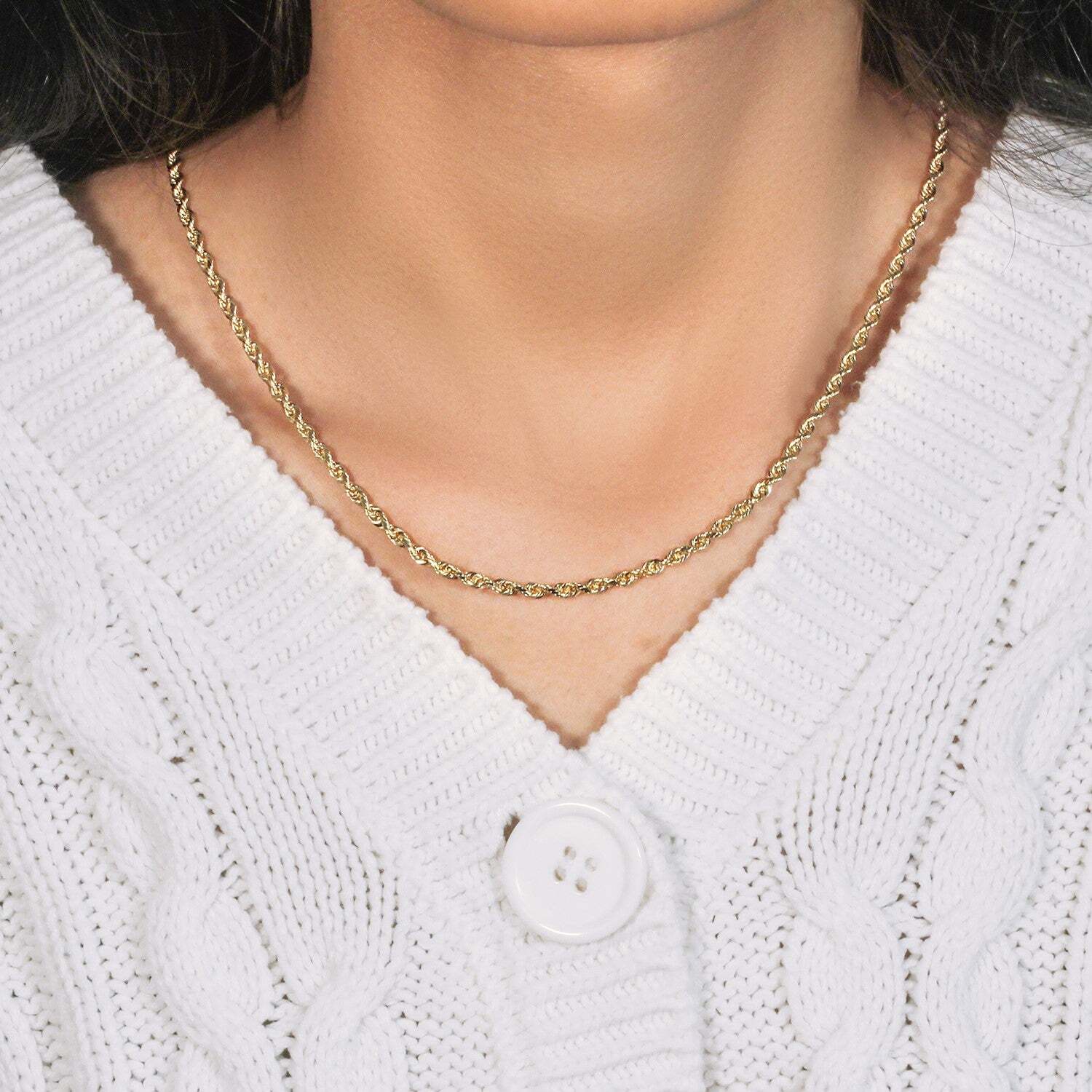 This solid diamond cut rope chain comes in 14k yellow gold and has a width of 3.0 millimeters.