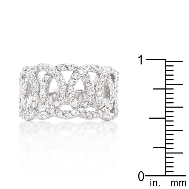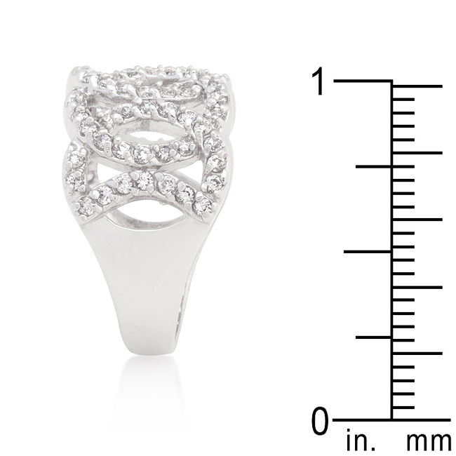 Multiple circles intertwine to create the sparkling illusion of this fashion ring. Our genuine rhodium finish is achieved using an electroplating process that coats the item with heavy layers of rhodium a close cousin to platinum which gives our jewelry a platinum luster.