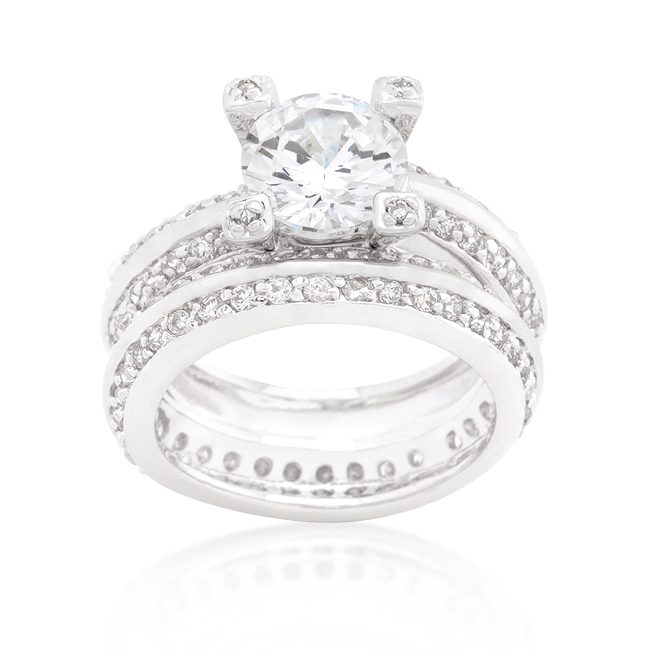 A large solitary stone sits atop a pave setting in this refined engagement ring set. Our genuine rhodium finish is achieved using an electroplating process that coats the item with heavy layers of rhodium a close cousin to platinum which gives our jewelry a platinum luster.