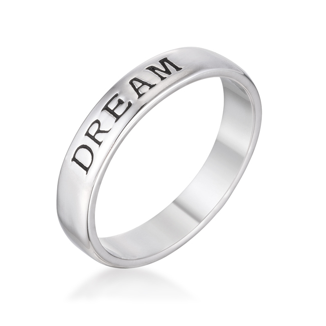 This rhodium plated eternity band is crafted with the same material that gives white gold its glorious shine. DREAM is right on the band. Its elegant and appropriate for casual wear or a night out.