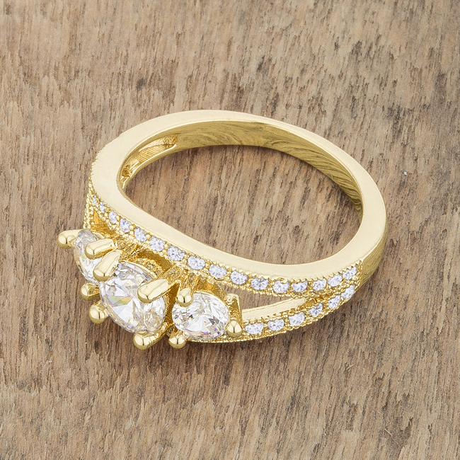 Clear stones accent the setting of a modern trio ring for a modernly classic look.