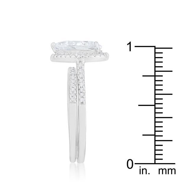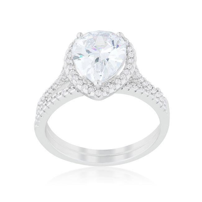 This halo style engagement ring is fashioned with a pear cubic zirconia center stone and two row shank. All stones are handset to perfection. Our genuine rhodium finish is achieved using an electroplating process that coats the item with heavy layers of rhodium a close cousin to platinum which gives our jewelry a platinum luster.