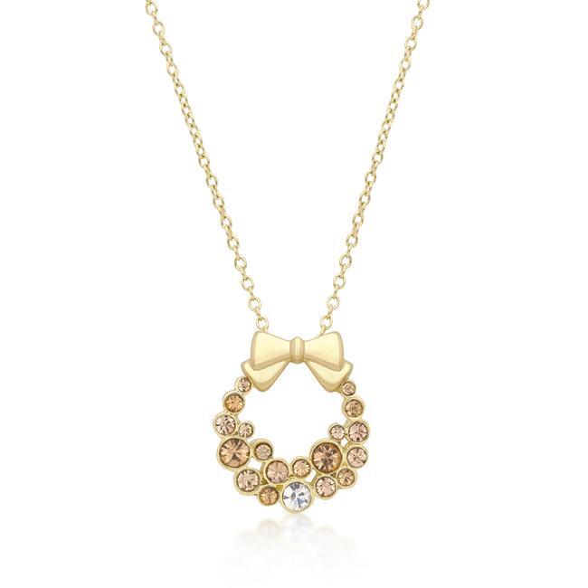 Spread holiday cheer with this holiday wreath pendant. Fashioned with elegant champagne crystals and a solitary clear crystal it’s the classic accompaniment to that holiday ensemble! 18k plated gold is achieved using an electroplating process that coats the item with heavy layers of 18k Yellow Gold and color-treated to display a perfect 14k Hamilton gold color.