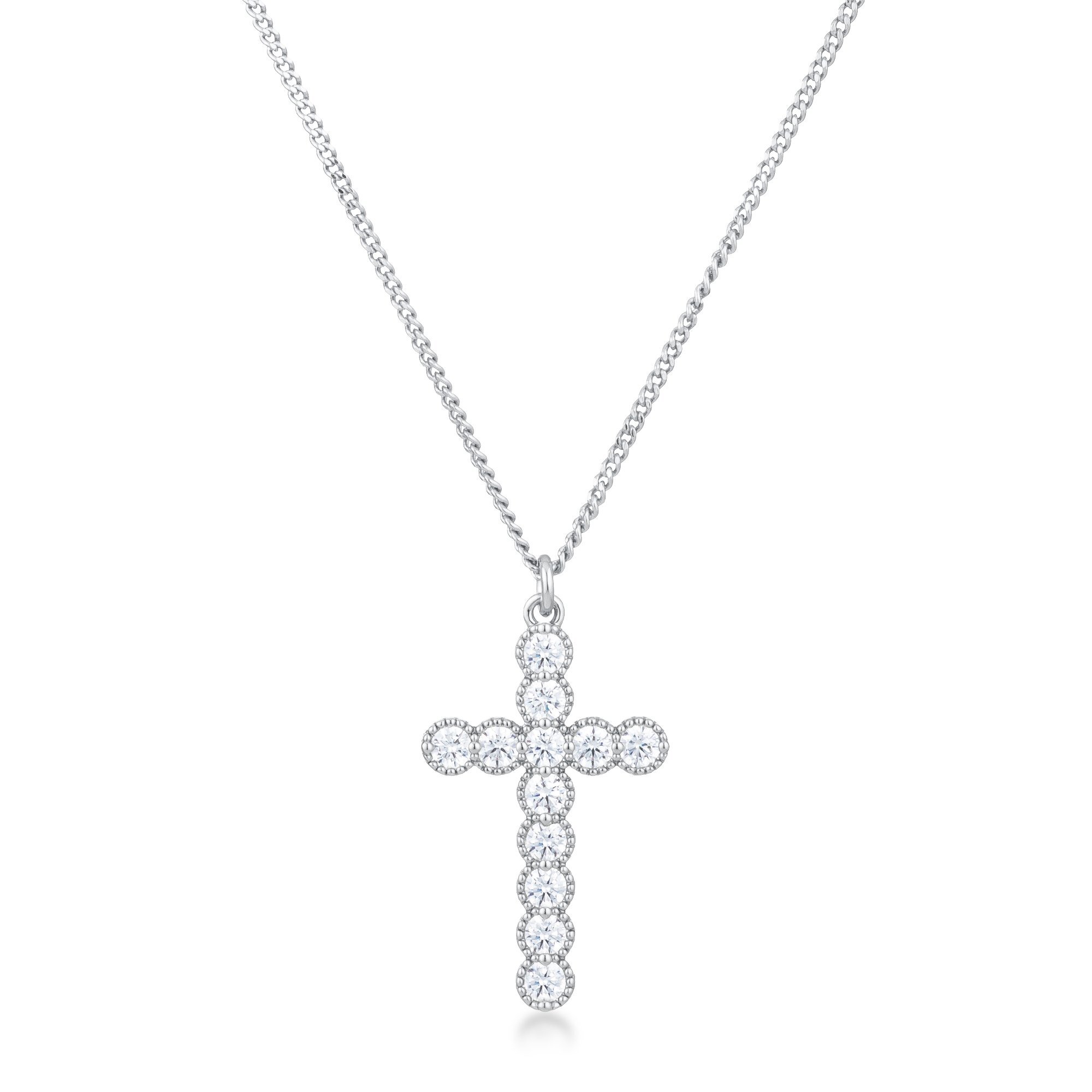 This classic cross pendant keeps to tradition without rendering it tiresome. This piece highlights 12 dazzling 3.25mm clear Cubic Zirconia stones embedded in a micro-beaded frame to add a flashy yet timeless touch. Sitting on a 16″ delicate chain with a 2″ extender allows its wearer options of length to accommodate any neckline.