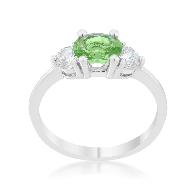 A pair of clear round cut stones accompany a peridot oval cut center stone in this elegantly simple 1.2 carat engagement ring.