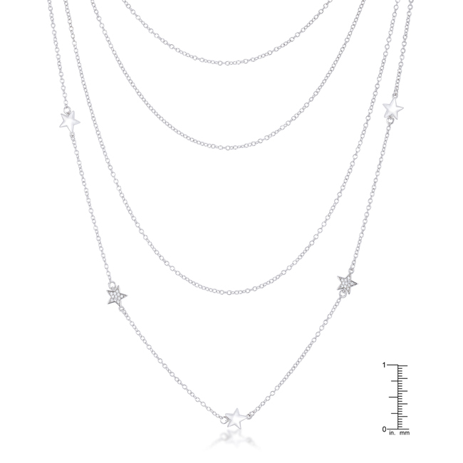 This lovely necklace features four elegant rhodium-plated chains. Rhodium famed as the metal that gives white gold its shine forms a lovely basis for the stars on the outermost chain and round cubic zirconia adds sparkle. The overall effect is a lovely necklace that is sure to draw comments and more.
