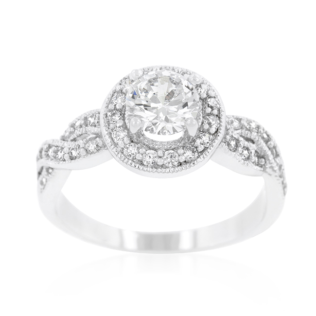 This halo style engagement ring is fashioned with round cut cubic zirconia and an infinity twisting shank. All stones are handset to perfection. Our genuine rhodium finish is achieved using an electroplating process that coats the item with heavy layers of rhodium a close cousin to platinum which gives our jewelry a platinum luster.