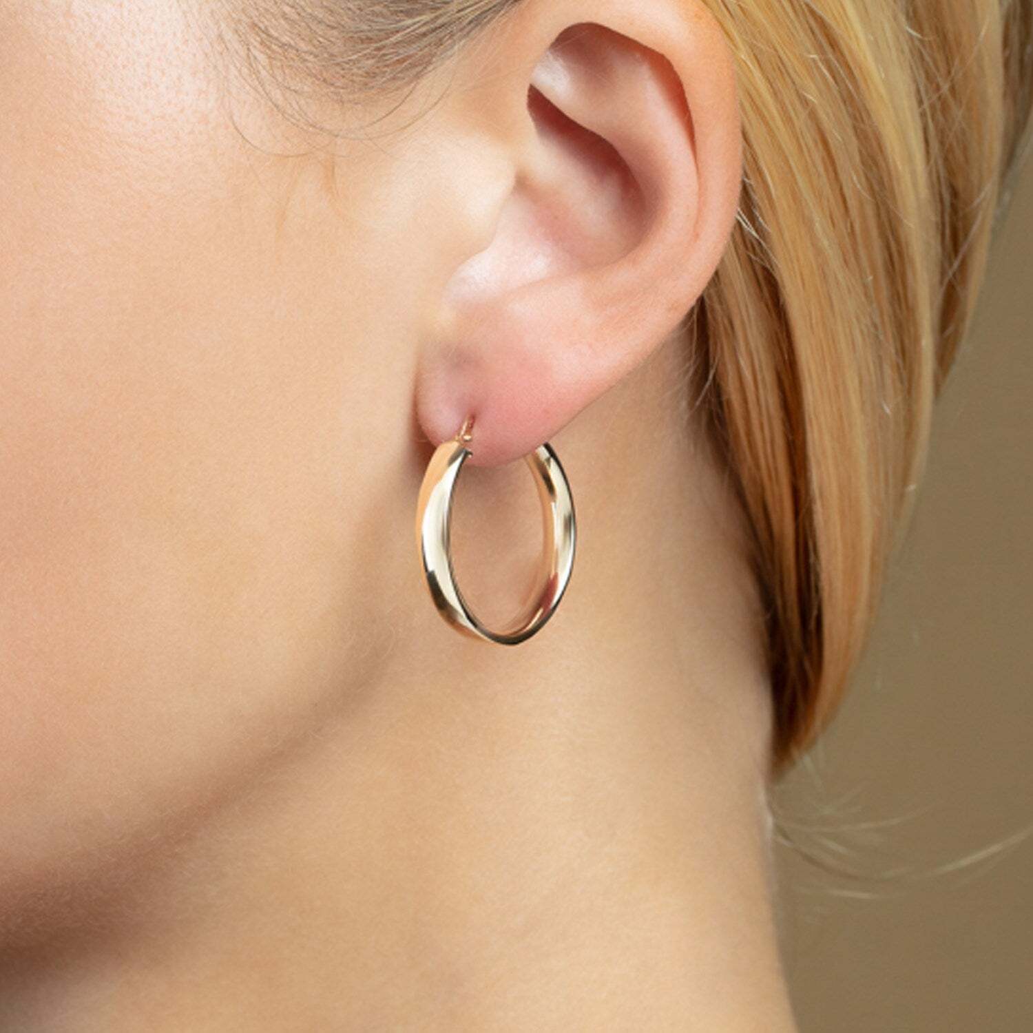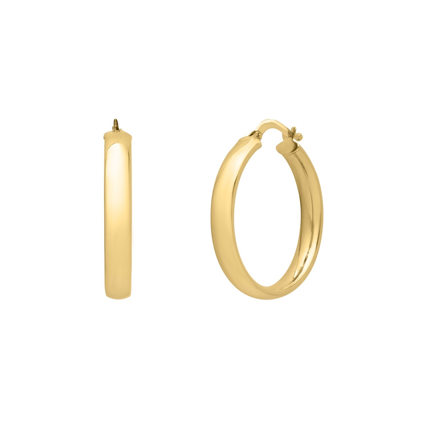 Elegant and striking, these small 14k yellow gold hoop earrings feature a smooth, polished surface reminiscent of a classic wedding band. Their understated design and hinged clasp ensure effortless wear and add a touch of subtle sophistication to any occasion.