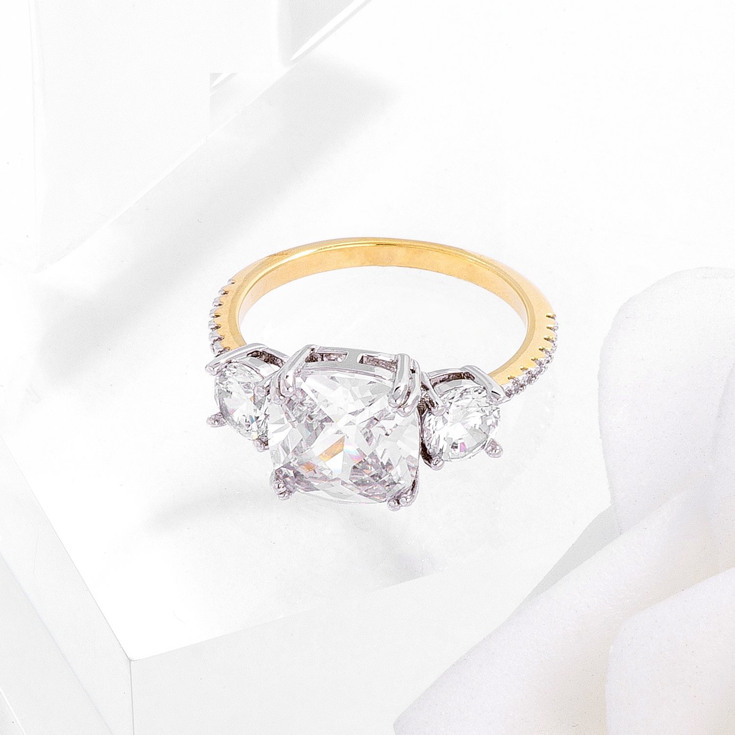 Inspired by the ultra chic and trendy duchess this elegant engagement ring features a 2.75Ct checkered cushion cut center stone. It is adorned with remarkable round stones on each side and a modern update of delicate thin ribbons of micropave CZ along the shoulders. This royal duchess ring is bathed in 18k gold and slightly dipped in genuine rhodium creating the perfect timeless look.