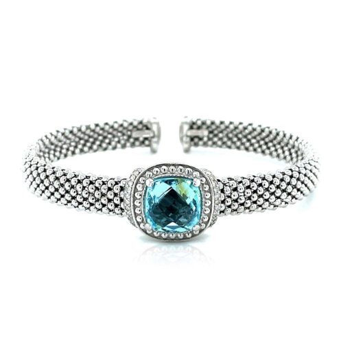 Popcorn Texture Cuff Bangle with Blue Topaz and Diamonds in Sterling Silver